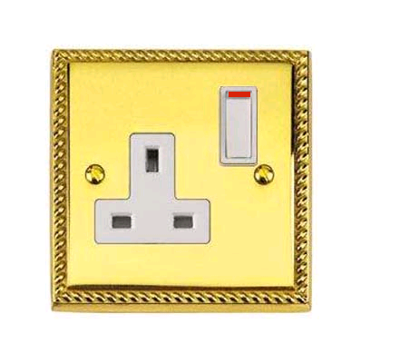 1 Gang 13 Amp Georgian Roped Brass Switched Plug Socket White Inserts