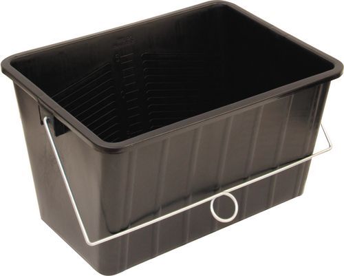 15ltr paint scuttle in black plastic with metal handle. Moulded ridged sides for loading paint roller. Takes all paint rollers up to 12".