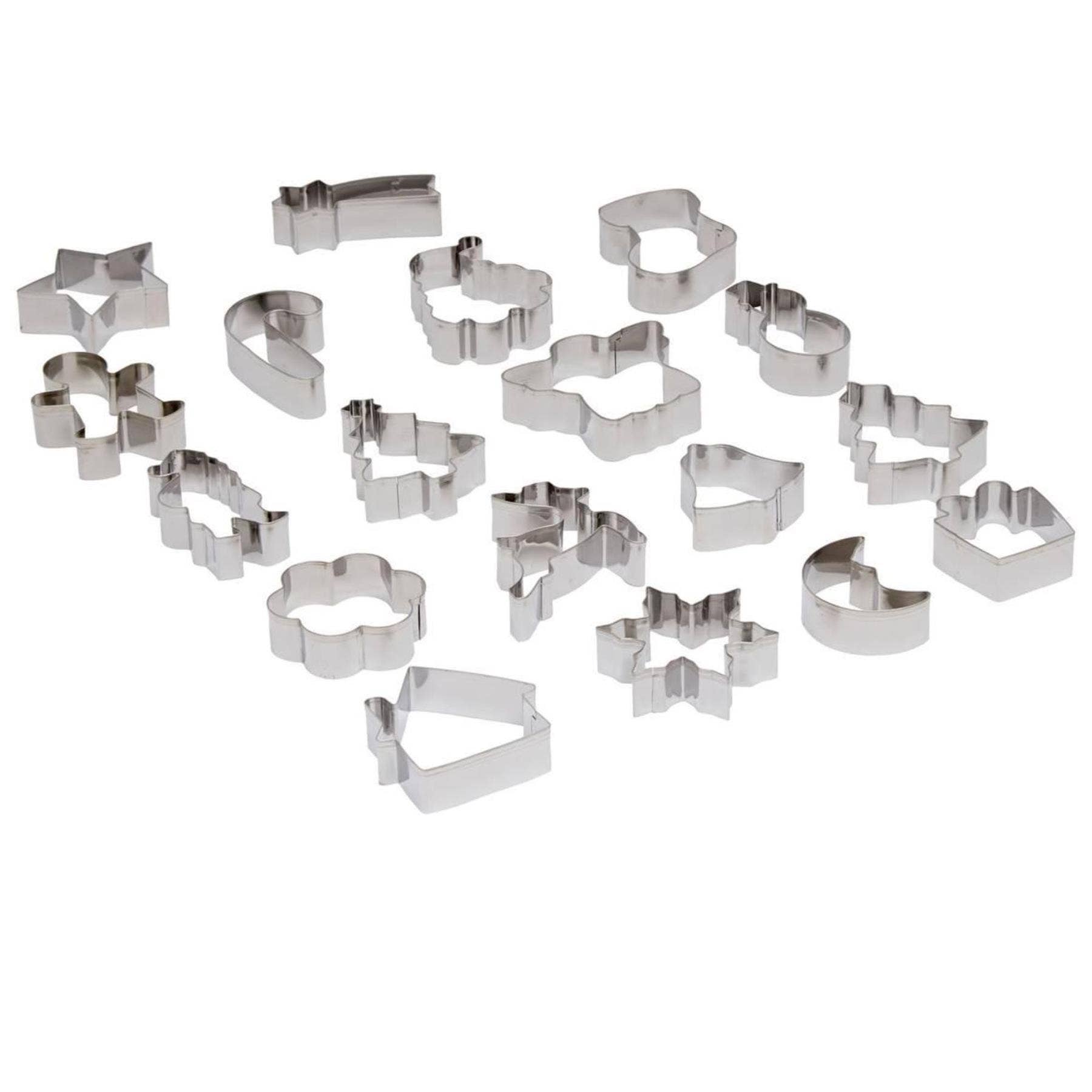 Includes 18 assorted cutters, offering a fun and festive selection of Christmas shapes such as stars, trees, bells, snowflakes, and more – ideal for baking or decorating.