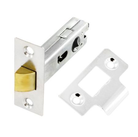 A tubular mortice latch in a chrome finish for internal wooden doors. A mortice latch is fitted into a rectangular or cylindrical mortice cut into the edge of the door. The spring-loaded latch bolt projects from the edge of the door and is retracted by the door handle spindle when the handle is turned, allowing the door to open.