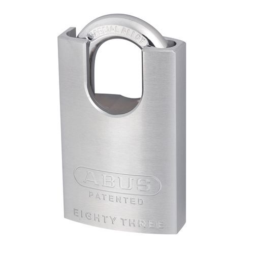 Abus 83 Series chrome plated brass body closed shackle heavy-duty padlock with a through hardened steel alloy NanoProtect Chrome Plated shackle (helping to make rusty shackles a thing of the past). 6 Pin tumbler cylinder with rust free components with, anti-pick mushroom pins, resists picking.