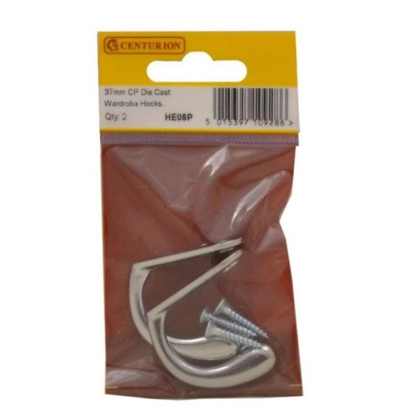 37mm Chrome Plated Die Cast Wardrobe Hooks (Pack of 2)