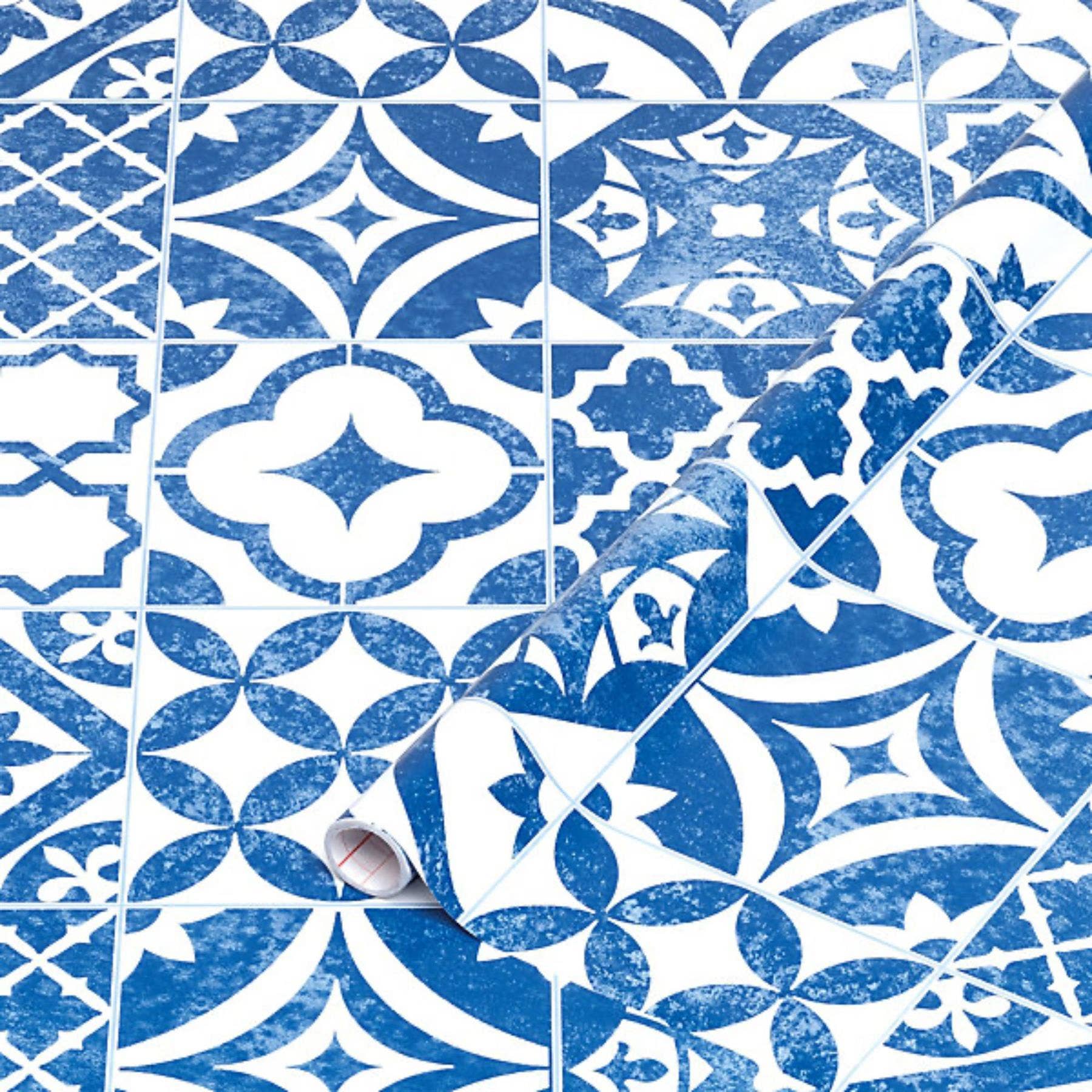 Adds a timeless blue and white geometric tile pattern to your home décor without the cost or permanence of real tiles.