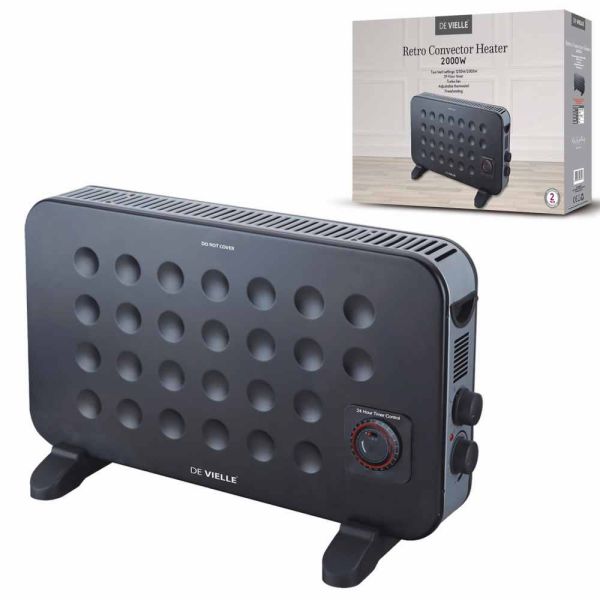De Vielle Retro 2000W Black Convector Heater - With Turbo Fan and Timer