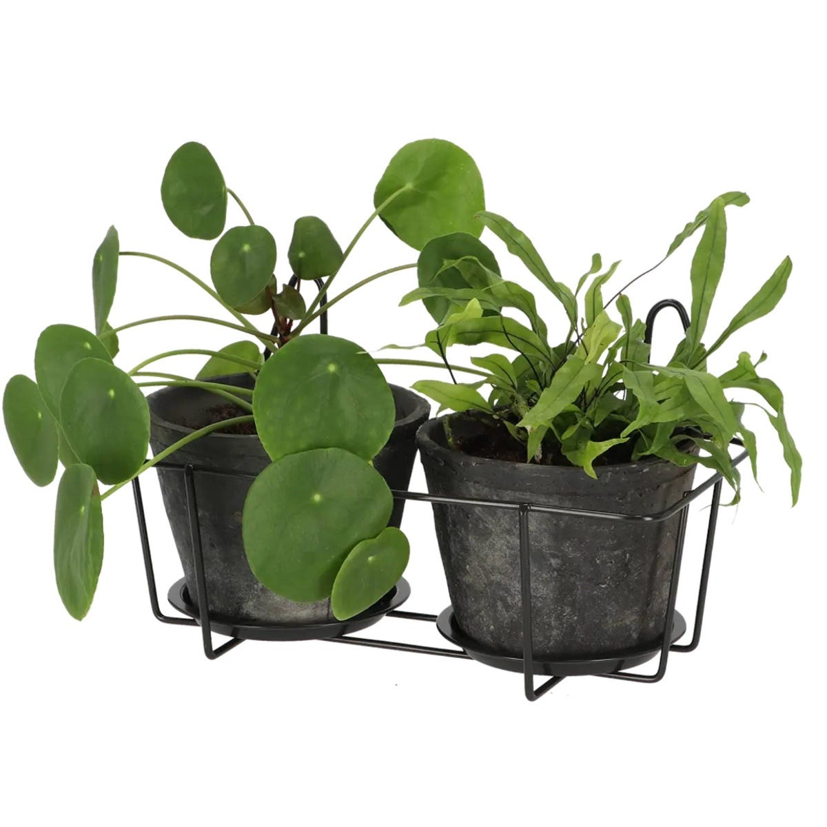 Holds two planters in one compact holder