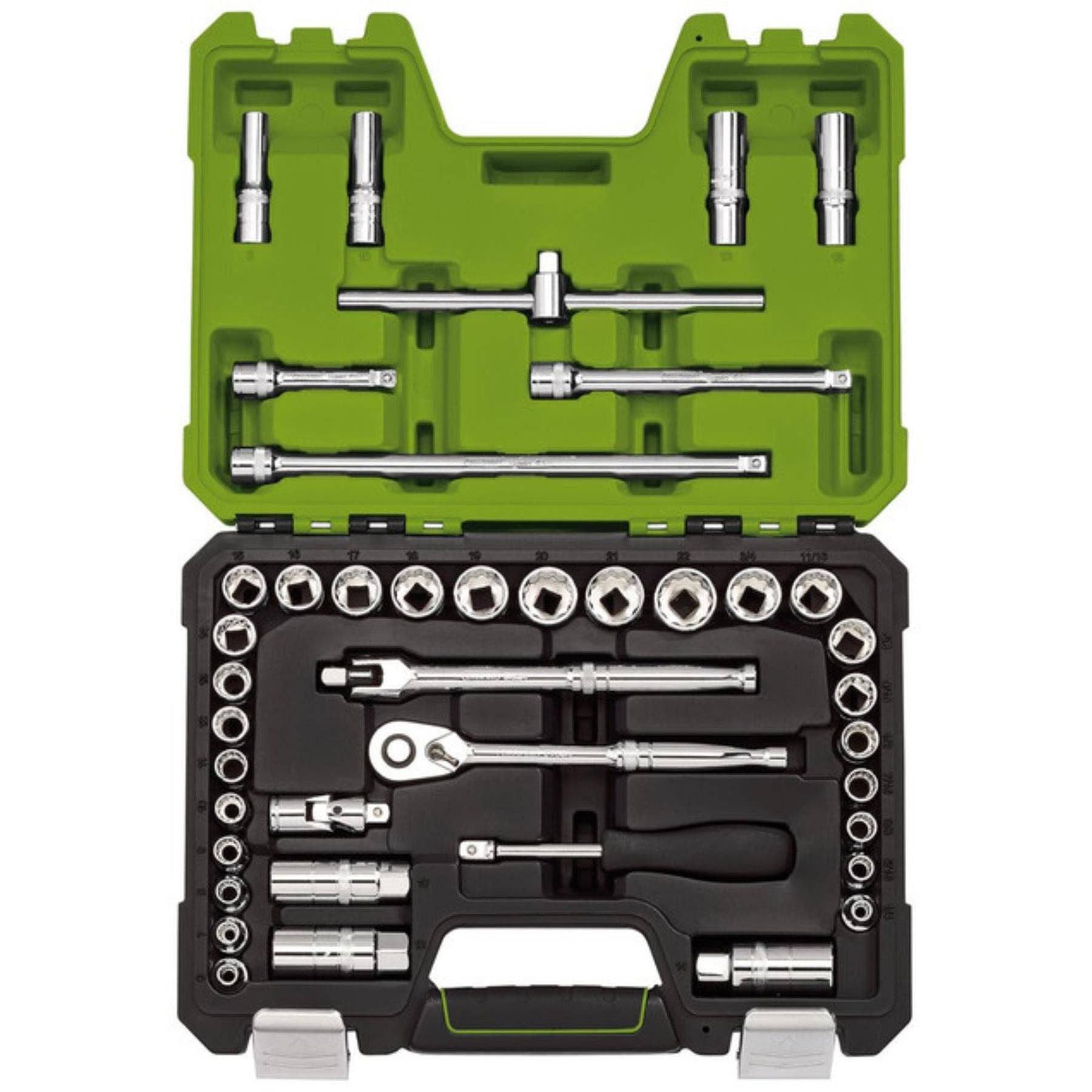 Every component is securely housed in a durable green carry case with custom-moulded inserts, perfect for on-the-go service work or organised garage storage.