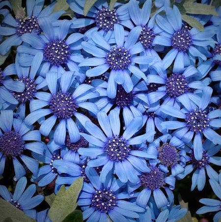 - Blue daisies! Pretty daisy-like sky blue blooms, covering deep green foliage throughout the summer until the first frosts!