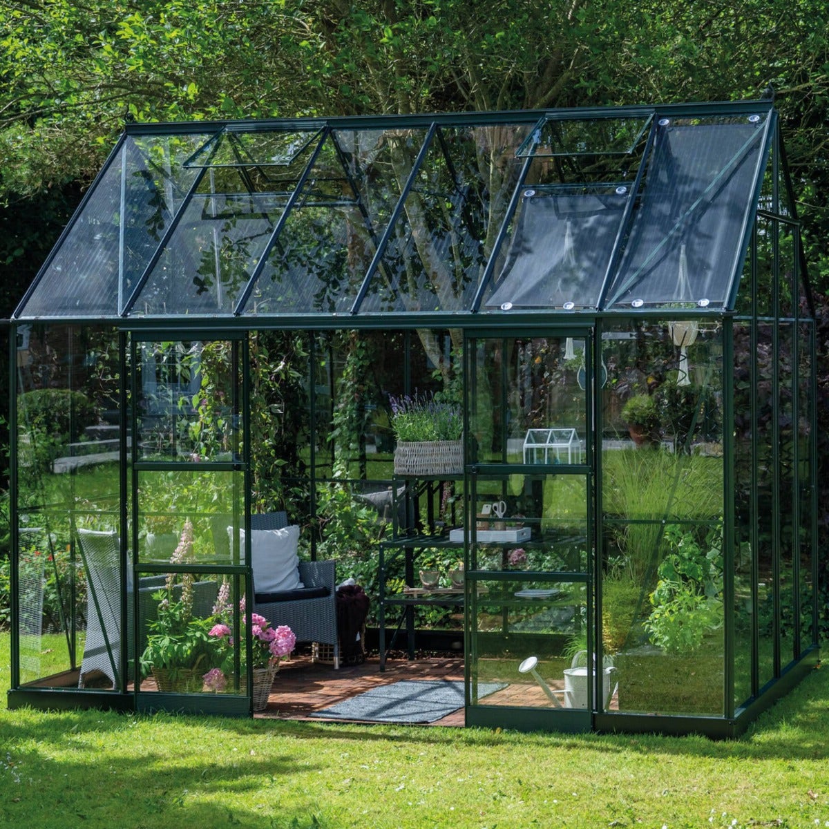 Constructed with a durable powder-coated green aluminium frame and glazed with 3mm toughened safety glass, the ICON 8 8x12 offers long-term reliability with added reassurance. Toughened glass ensures excellent light transmission while delivering greater strength and safer breakage characteristics than standard horticultural glass, making it ideal for busy or exposed gardens.