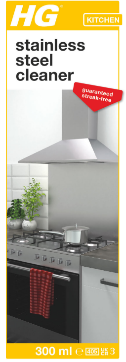 - Spray an even spray from a distance of approx. 20cm onto the surface or apply HG rapid stainlesssteel cleaner by spraying it onto a soft clean cloth.
