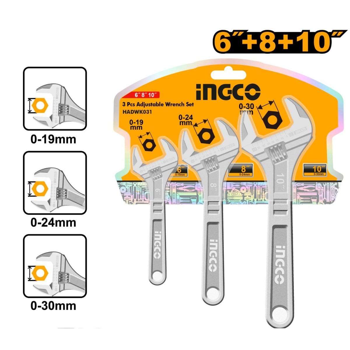 Ingco Adjustable Wrench Set 3 Piece | 150mm, 200mm & 250mm Drop-Forged Carbon Steel