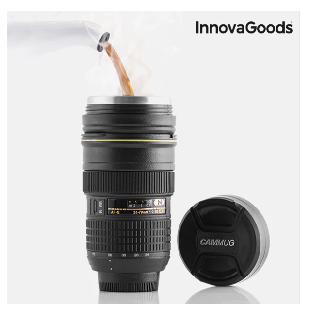 An unusual, practical multifunctional cup that looks like a professional camera lens. Its design with a lid means you can take it anywhere without worrying about spilling its content.