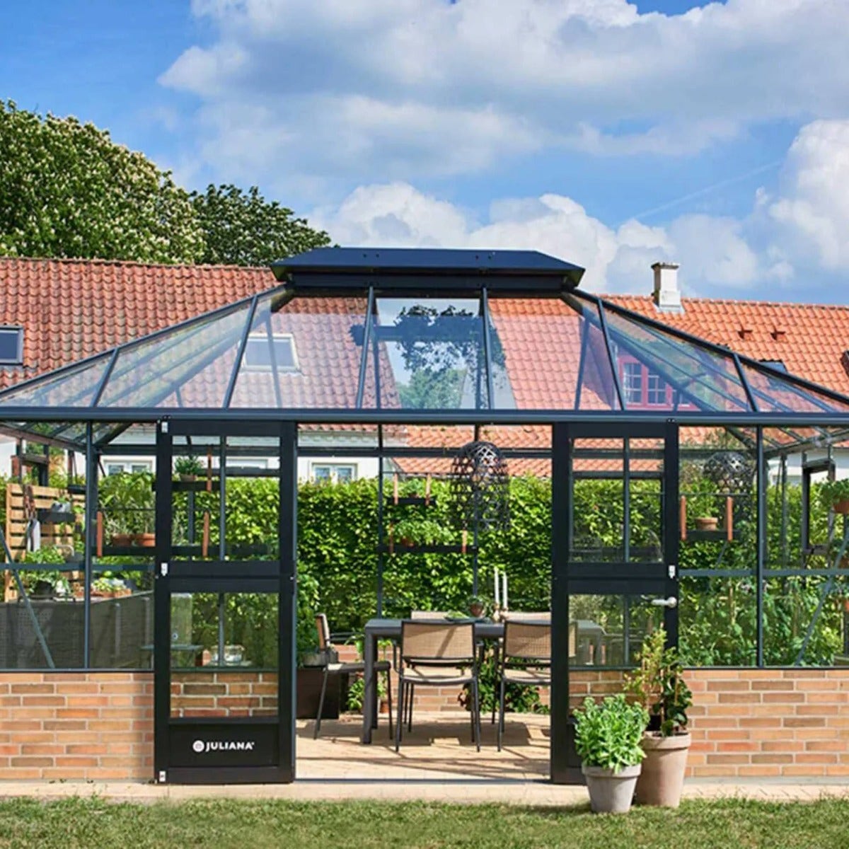 The Juliana Grand Oase 16x12 Dwarf Wall Greenhouse in Anthracite/Black combines the impressive scale of the Grand Oase range with the added strength and traditional appeal of a solid base wall. Designed for gardeners who want a premium growing and entertaining space, this model delivers both architectural presence and exceptional practicality.
