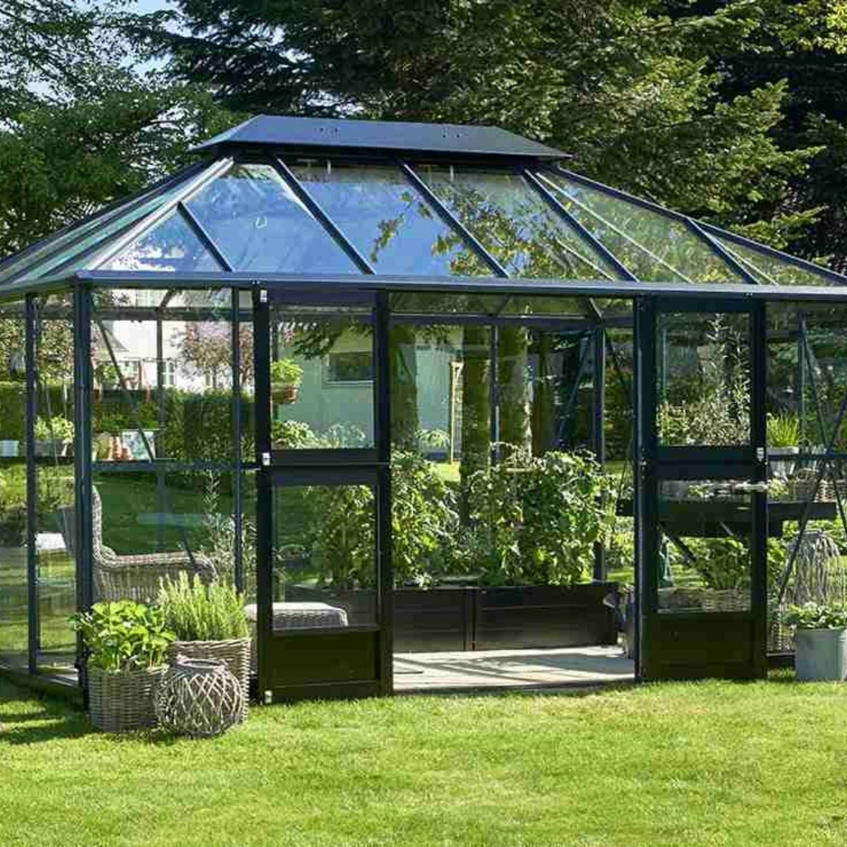 The Juliana Grand Oase 14x9 Greenhouse in Anthracite/Black is a premium garden structure that perfectly balances practical growing space with contemporary garden-room styling. With its generous footprint and impressive height, it offers ample room for cultivating plants while also creating a bright, relaxing space to sit and enjoy your garden.