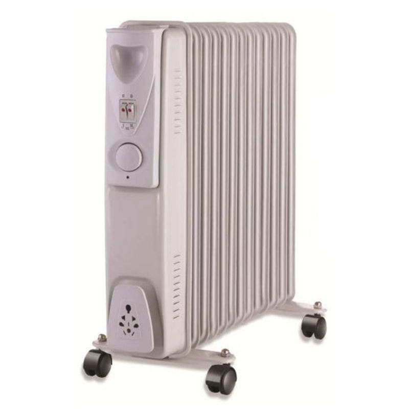 - This 13 fin oil filled radiator comes manufactured with 3 heat settings, simple controls, an adjustable thermostat & is mounted on castors for easy movement.