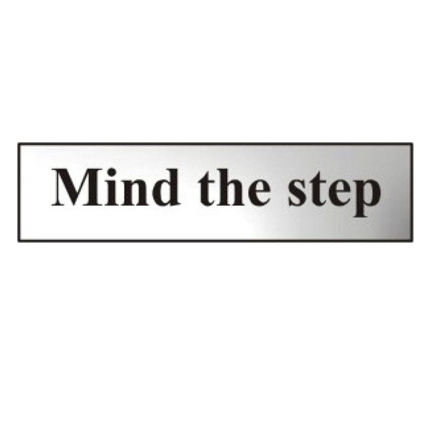 - Black "Mind The Step" text on a polished chrome effect material