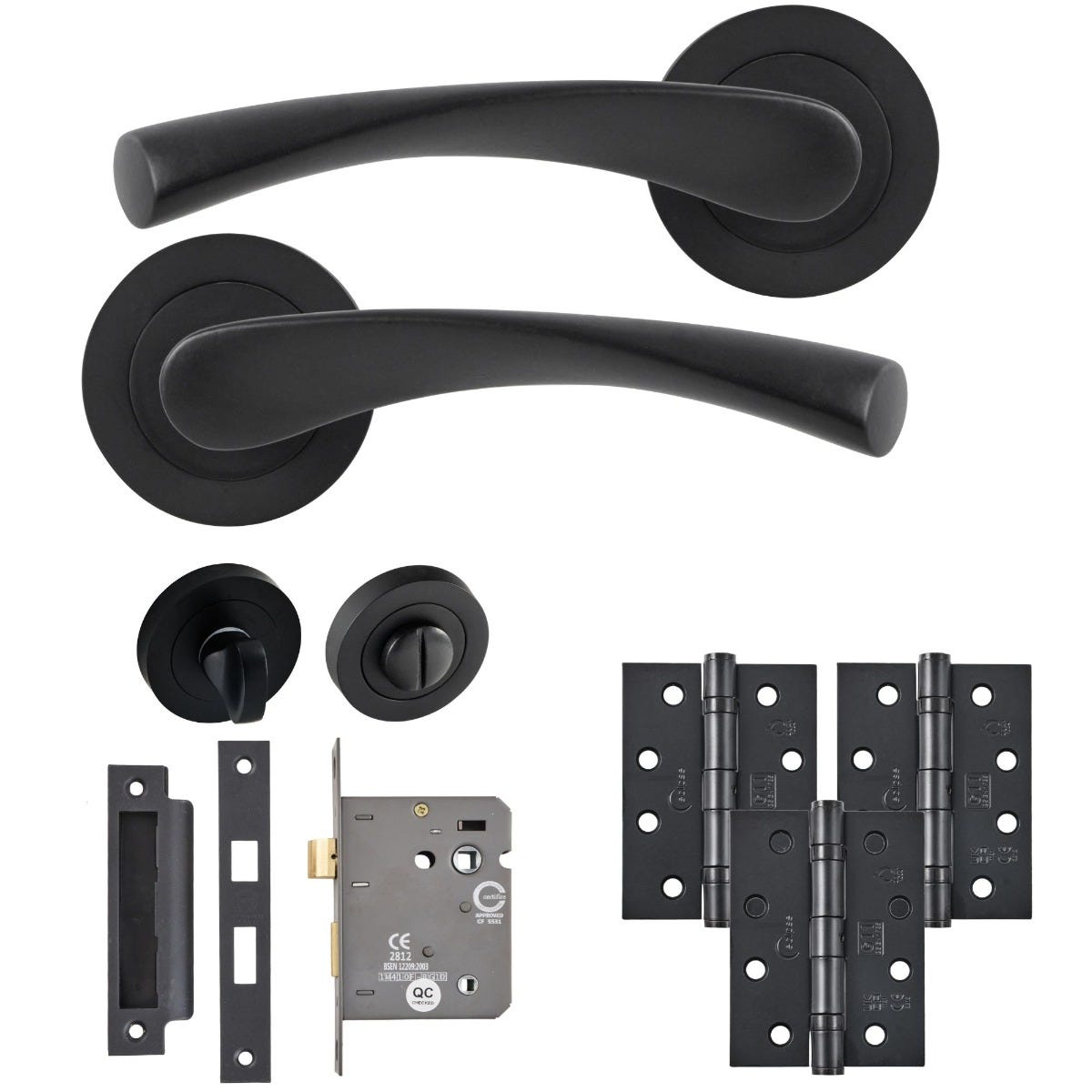 Monza WC Bathroom Door Handle Pack Black – Lever on Rose Set with Lock, Hinges & Thumb turn