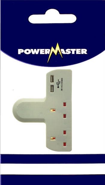 Powermaster T-Shaped 2 Way Adaptor With 2 USB Ports