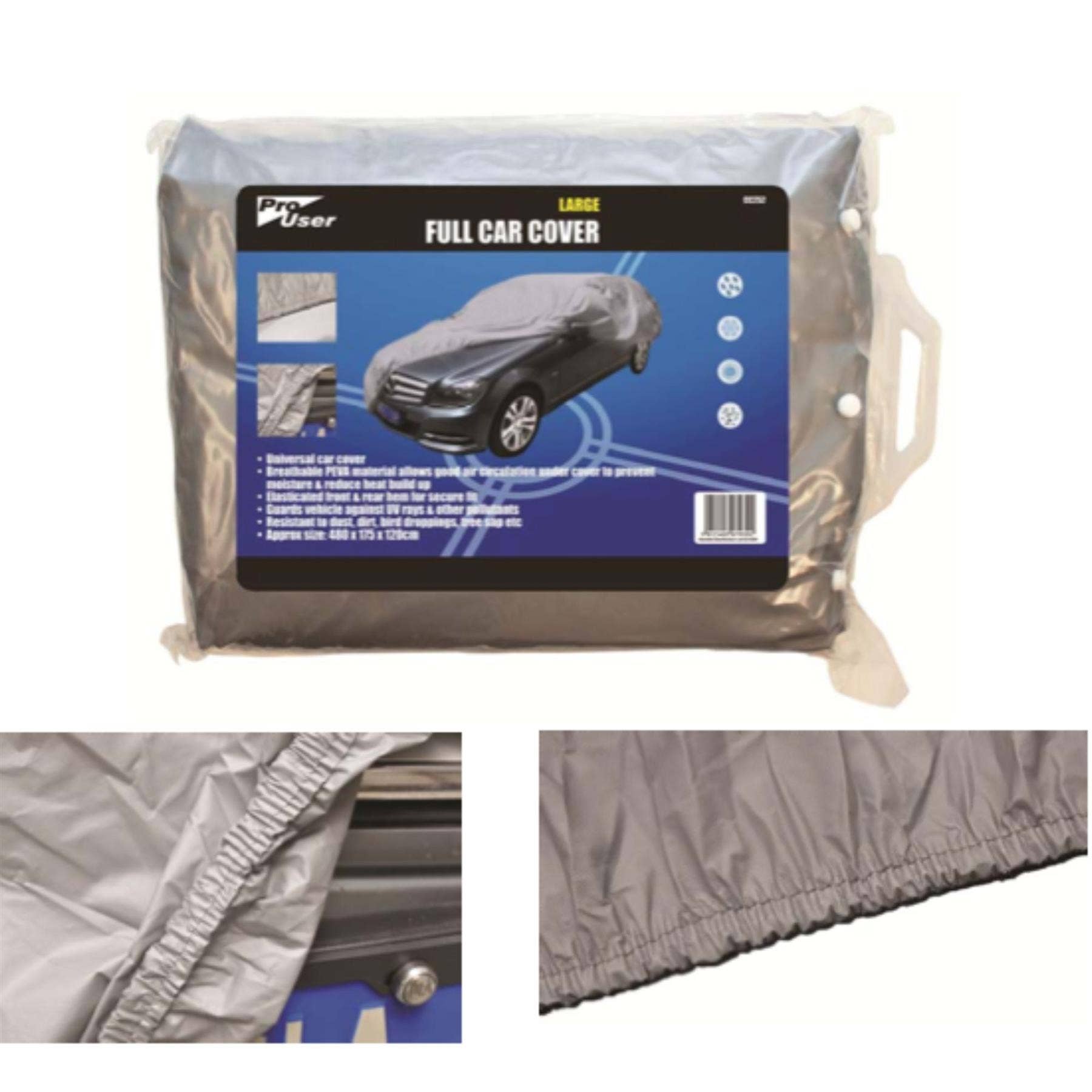 Protect your vehicle from the elements with the Pro User Large Full Car Cover, designed to shield against dust, dirt, UV rays, bird droppings, and tree sap. Manufactured from high-quality breathable PEVA material, this cover allows air circulation to prevent condensation build-up while reducing interior heat. With elasticated hems at the front and rear, it offers a secure fit for most large vehicles, keeping your car safe from pollutants and weathering all year round.