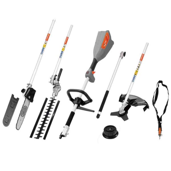 - 4 in 1 Tool, Trimmer, Brushcutter blade, 16in/400mm Dual action hedge cutter, 8in /200mm Pruning chainsaw, plus 30in/76cm Extension pole included for use with Pruning saw only