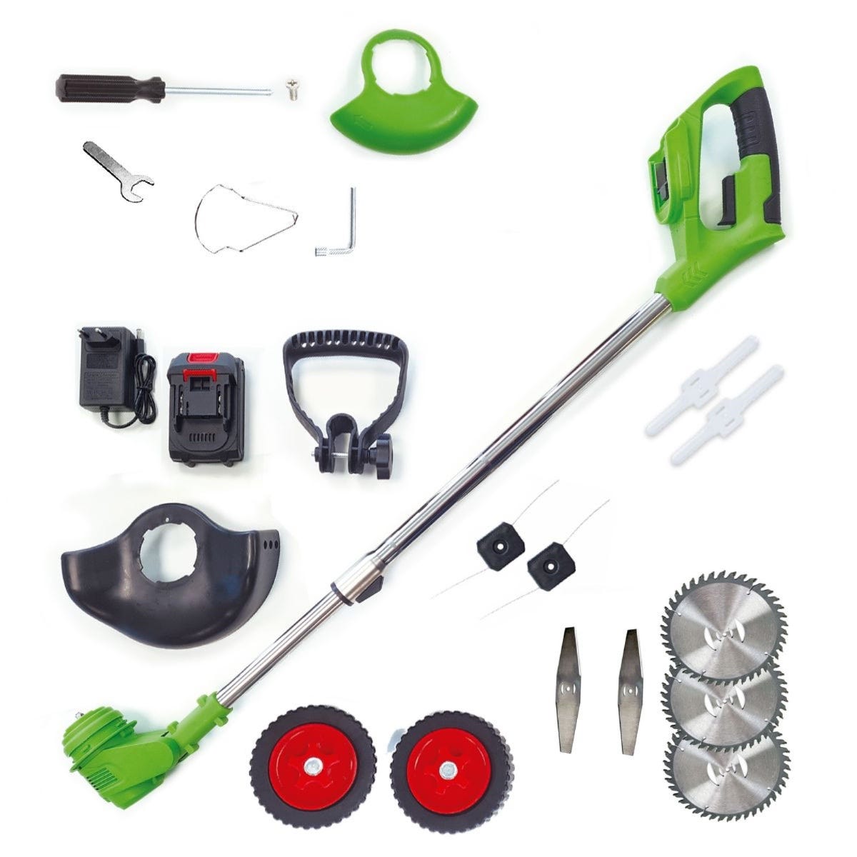Comes with three serrated discs and two metal cutting blades for tackling dense brush, thick weeds and tougher garden growth.