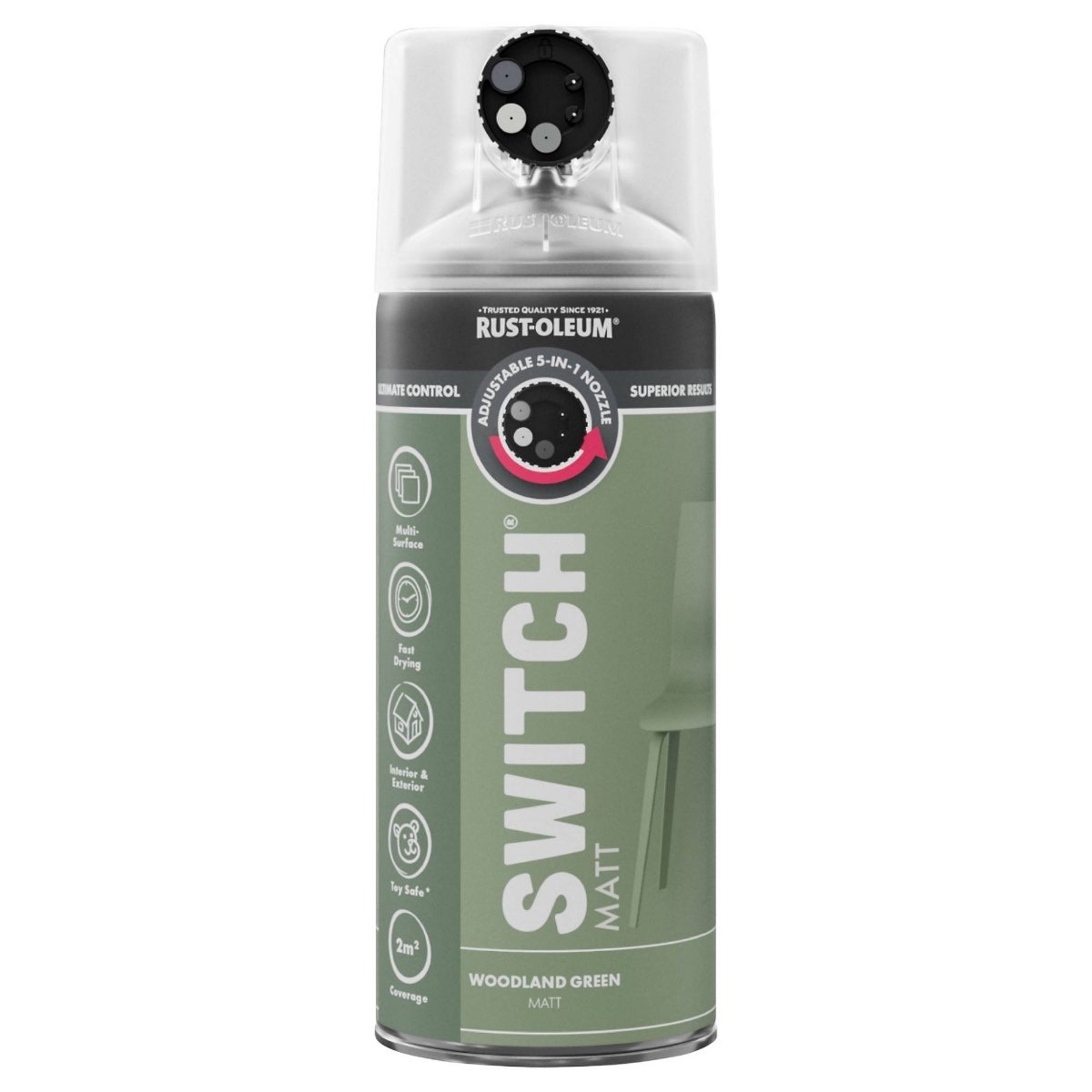 Rust-Oleum Switch Woodland Green Matt Multi-Surface Spray Paint 400ml – 5-in-1 Adjustable Nozzle