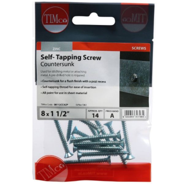 Self Tapping Screws PZ Countersunk Zinc 8 x 1 1/2 (4.2 x 38mm) Pack of 14