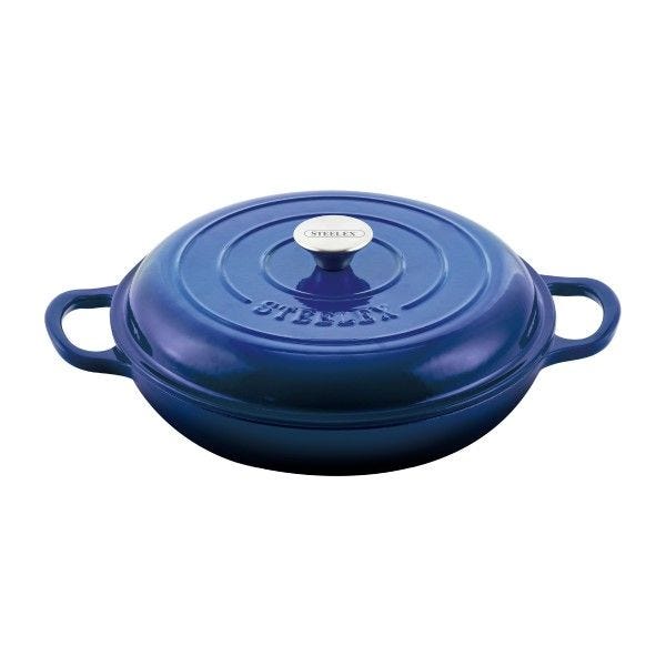 Steelex Bistro 28cm Blue Cast Iron Sauté Pan – 2.73L Shallow Casserole Dish with Self-Basting Lid