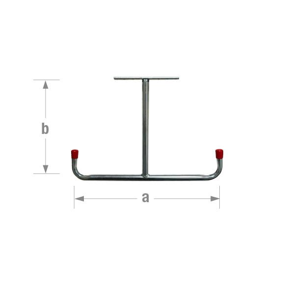 A T-shape ceiling hook has a flattened T-shaped base plate that is screwed to the ceiling surface — the wide arms of the T distribute the fixing load across the ceiling board — with a downward hook or ring projecting from the centre for hanging items. This design gives more secure fixing than a single-point screw hook on plasterboard or timber-lined ceilings.