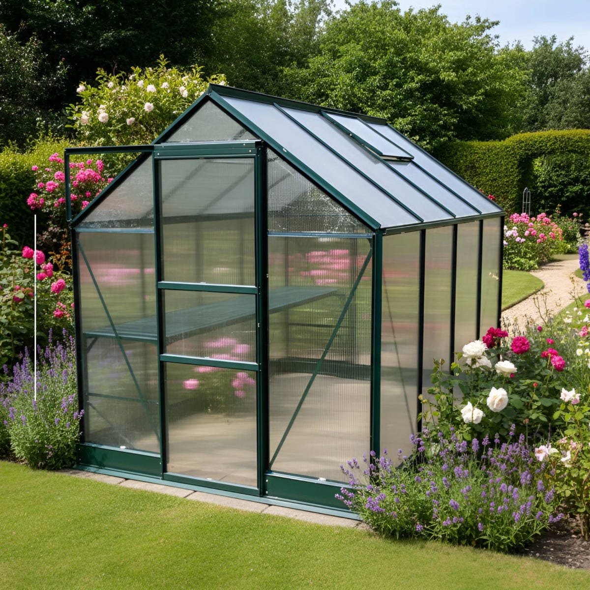 This model is fitted with polycarbonate glazing, a lightweight, shatter‑resistant option that offers excellent insulation and diffused light. It helps maintain more stable temperatures inside, reduces the risk of scorching, and provides a safer environment for households with children or pets.