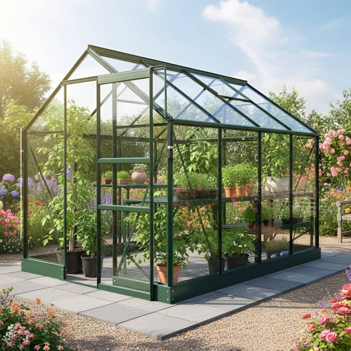The Vitavia Apollo 6700 6 × 10 ft Green Greenhouse offers a spacious and bright growing environment, perfect for gardeners who want extra room for a wide variety of plants. Finished in an attractive powder‑coated green, it blends seamlessly into any garden while delivering excellent durability through its strong anodised aluminium frame. The generous internal space makes it ideal for cultivating vegetables, flowers, and seedlings throughout the year.