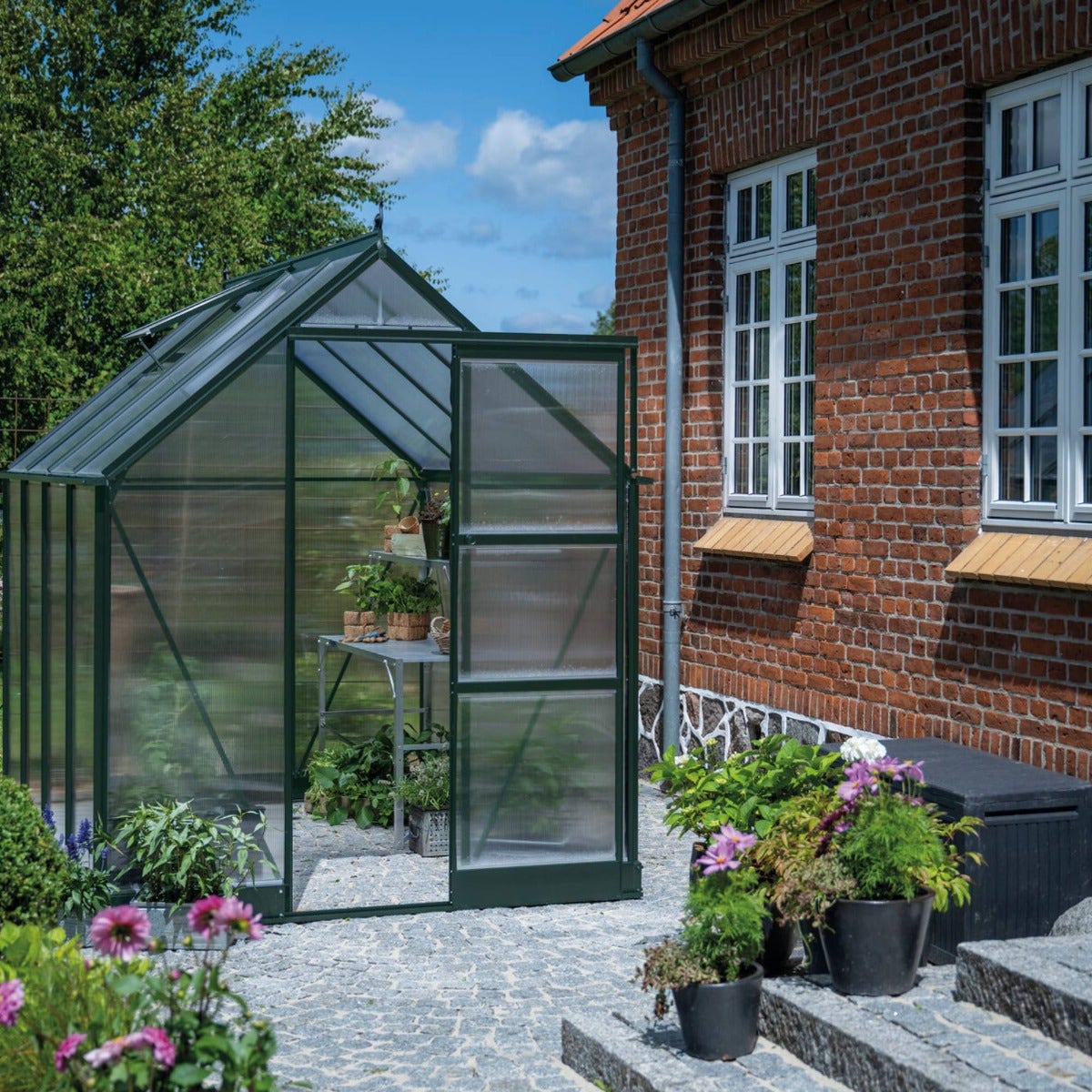 The Halls ICON 6 6x8 Greenhouse in green with 4mm polycarbonate glazing offers an excellent balance of space and proportion. Its extended 6x8 footprint provides generous room to move, organise plants, and arrange staging without overwhelming your outdoor space. Designed to sit neatly within most Irish gardens, this freestanding greenhouse features high eaves and improved airflow, making everyday watering, potting, and plant care more comfortable — delivering the usability of a larger greenhouse in a family-friendly footprint.