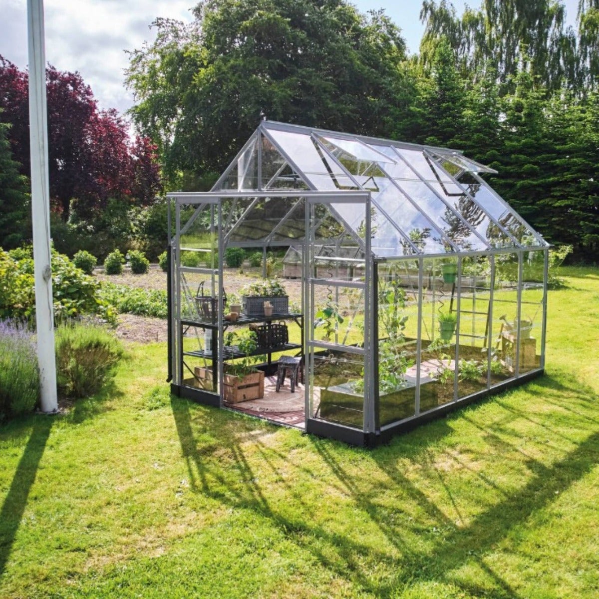 Built with a durable mill finish aluminium frame, quality 3mm horticultural glass, and an optimised roof design, the ICON 6 8x10 combines strength with clean, understated styling. The mill finish frame provides excellent corrosion resistance with minimal maintenance, while the horticultural glass ensures strong natural light transmission to support healthy plant growth. Designed to perform reliably in Irish weather conditions, it offers stability and dependable year-round use. A low-threshold sliding door allows easy movement of trays, compost, and tools while preserving valuable internal growing space.