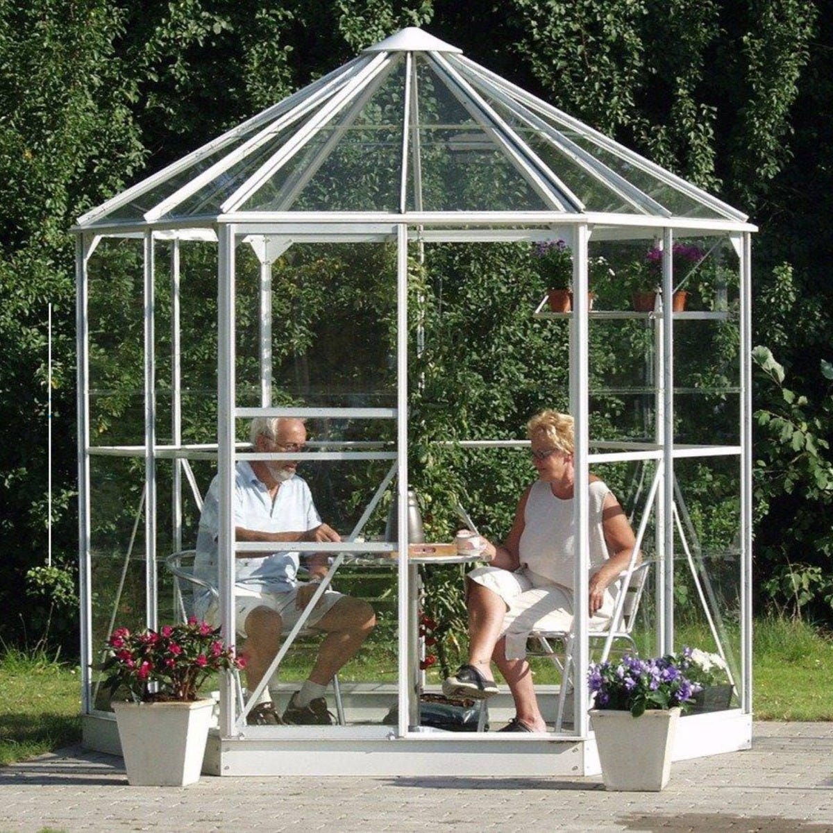 The Vitavia Hera Aluminium Greenhouse is a stunning garden room-style greenhouse designed to beautify any garden. With its unique hexagonal design and durable aluminium construction, it provides a productive environment for your plants while also serving as a stylish and aesthetic addition to your outdoor space.