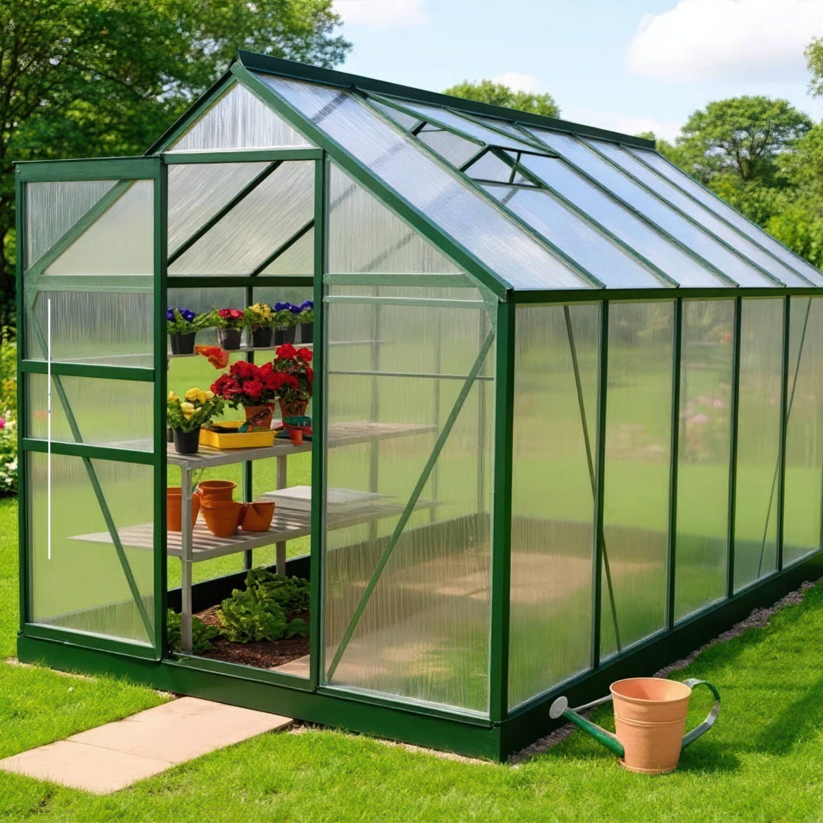 The robust green powder‑coated frame not only looks attractive in any garden but also offers long‑lasting protection against rust, corrosion and weathering. The twin‑wall polycarbonate panels provide superior thermal efficiency, helping to maintain stable temperatures inside the greenhouse and protecting plants from harsh direct sunlight. Their shatter‑resistant nature makes them ideal for family gardens, high‑traffic areas, windy locations and allotments where safety and durability are essential.