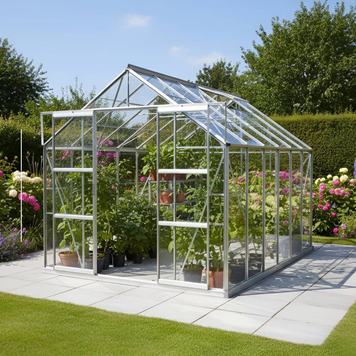 Glazed with toughened safety glass, this model offers clearer light transmission with superior impact resistance and safer breakage—shattering into small granular pieces rather than sharp shards. The double sliding doors and low‑threshold entrance make access smooth and wheelchair‑friendly, while four opening roof vents provide excellent airflow to regulate heat and humidity. Additional practical features include an integral perimeter base for improved rigidity and integral gutters for easy rainwater collection.